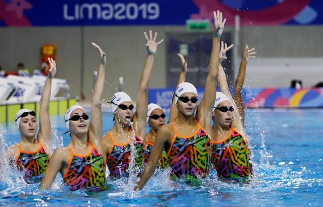 FILE - In this July 25, 2019, file photo, the synchronized swimming team of Cuba performs their routine during a training session at the Pan Am Games in Lima, Peru. Forget boxing or rugby. The most hardcore sport at the Tokyo Games may just be artistic swimming. The sport once known as synchronized swimming has rapidly evolved into one of the most physically grueling specialties at the Olympics. (AP Photo/Fernando Vergara, File)