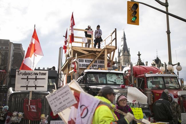 Protestors gather along Wellington Street as a protest against COVID-19 restrictions that has been marked by gridlock and the sound of truck horns reaches its 14th day, in Ottawa, Thursday, Feb. 10, 2022. THE CANADIAN PRESS/Nick Iwanyshyn
