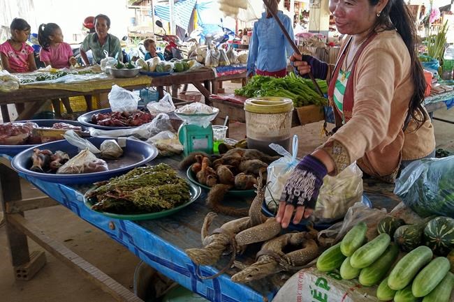 In this undated photo released by the World Wildlife Fund, a woman displays monitor lizards, squirrels and wild birds for sale at an open air market in Attapeu, Laos. A report released by the World Wildlife Fund, Friday, April 1, 2022, shows illegal purchases of wildlife online are growing in Myanmar in a threat both to public health and to endangered species. (K. Yoganand/World Wildlife Fund via AP)