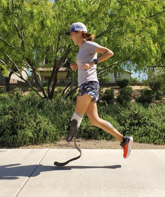 In this image provided by Edwin Broersma, marathoner Jacky Hunt-Broersma trains on Aug. 28, 2021 at San Tan Mountain Regional Park, in San Tan Valley, Az. Hunt-Broersma lost her left leg below the knee to a rare form of cancer, but she hasn't let that stop her and is trying to cover the classic 26.2-mile marathon distance at least 102 times in 102 days, which would set a new world record. The Boston Marathon on April 18 is expected to be No. 92 in her streak. (Edwin Broersma via AP)