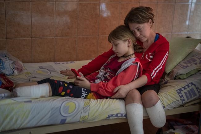 Natasha Stepanenko, 43, sits on her bed with her daughter Yana, 11, at a public hospital in Lviv, Ukraine, Saturday, May 15, 2022. On April 8, a missile struck the train station in the eastern city of Kramatorsk where Natasha, Yana and her twin brother Yarik were planning to catch an evacuation train heading west and, they hoped, to safety. Yana lost two legs, one just above the ankle, the other higher up her shin. Natasha lost her left leg below the knee. (AP Photo/Emilio Morenatti)