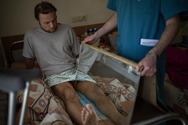 Sasha Horokhivskyi, 38, performs mirror therapy to mitigate phantom pains at a public hospital in Kyiv, Ukraine, Thursday, April 28, 2022. Sasha lost his leg above the knee on March 22 after being shot in the calf by a territorial defense member who mistook him for a spy after he stopped to take photos of bombed buildings near his home.(AP Photo/Emilio Morenatti)