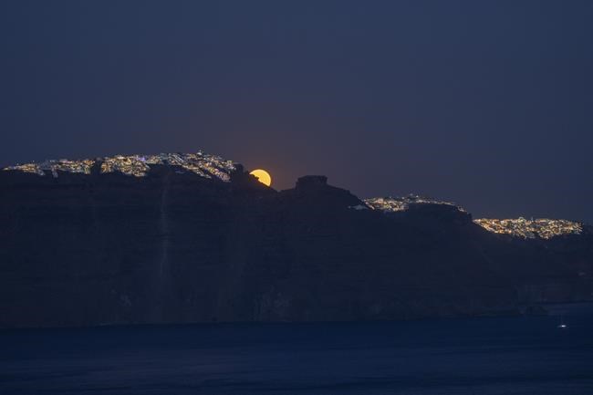 The moon rises behind the village of Imerovigli, left, and the rocky promontory of Skaros, right, on the Greek island of Santorini on Tuesday, June 14, 2022. The Catholic Monastery of St. Catherine was founded at Skaros in 1596, but after an earthquake it was moved to the town of Thira, far right. (AP Photo/Petros Giannakouris)