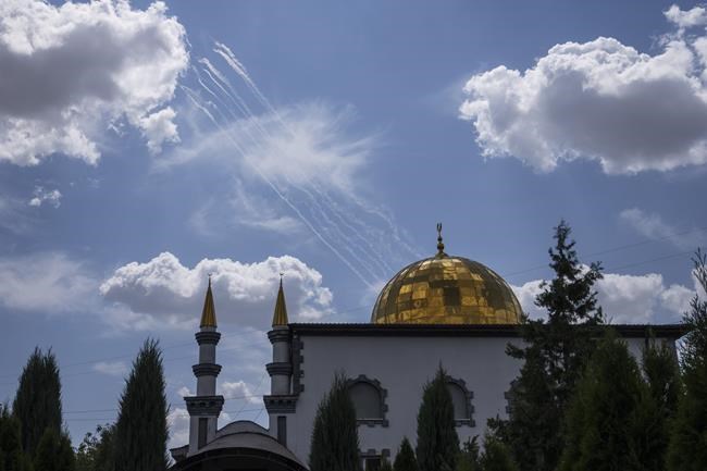 Rockets are launched through the air, near Medina Mosque, on the first day of Eid al-Adha, in Konstantinovka, eastern Ukraine, Saturday, July 9, 2022. (AP Photo/Nariman El-Mofty)