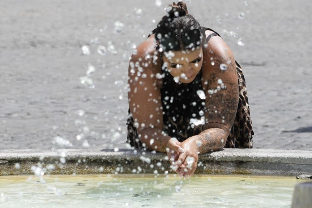 A woman leans by the Lions fountain in Rome, Tuesday, July 18, 2023. Tourist flock to the eternal city while scorching temperatures grip central Italy with Rome at the top of the red alert list as one of the hottest cities in the country. (AP Photo/Gregorio Borgia)