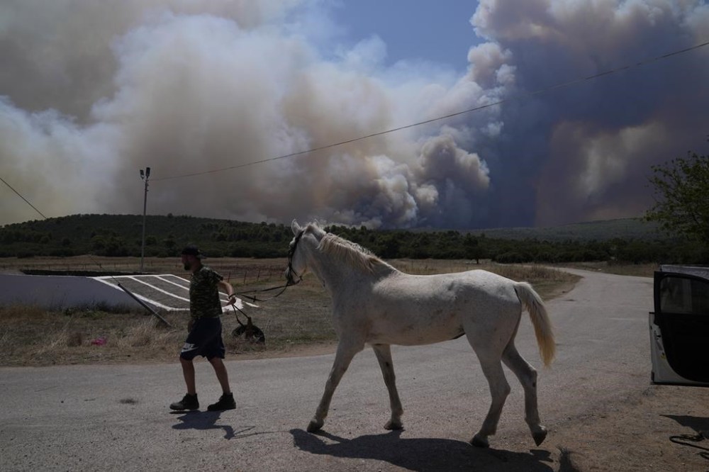 A man evacuates a horse from a stable as smoke plumes from a fire are seen in the background at Pournari village near Athens, Greece, on Tuesday, July 18, 2023. In Greece, where a second heatwave is expected to hit Thursday, three large wildfires burned outside Athens for a second day. Thousands of people evacuated from coastal areas south of the capital returned to their homes Tuesday when a fire finally receded after they spent the night on beaches, hotels and public facilities. (AP Photo/Thanassis Stavrakis)