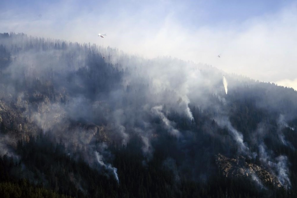 A helicopter drops water on smoke from a burnt forest above the communes of Bitsch and Ried-Moerel, in Ried-Moerel, Switzerland, Tuesday, July 18, 2023. Helicopters flew throughout Monday night to fight the forest fire raging in the Upper Valais. (Jean-Christophe Bott/Keystone via AP)