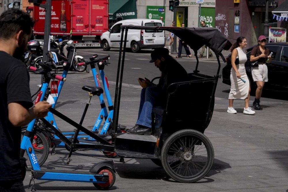 A tourist peddle-taxi driver waits in the shade for customers in Madrid, Spain, Tuesday, July 18, 2023. Temperatures are expected to peak today in some Mediterranean countries, with thermometers possibly hitting about 46 Celsius (114.8) in some parts of Spain (AP Photo/Paul White)