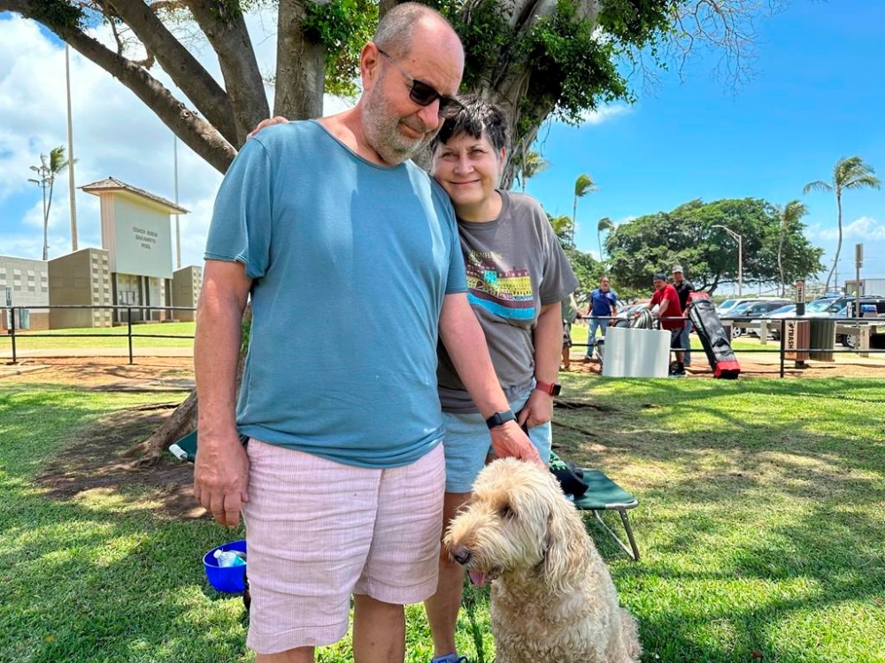 Lahaina residents Kamuela Kawaakoa and Iiulia Yasso described their harrowing escape under smoke-filled skies. The couple and their 6-year-old son got back to their apartment after a quick dash to the supermarket for water, and only had time to grab a change of clothes and run as the bushes around them caught fire.