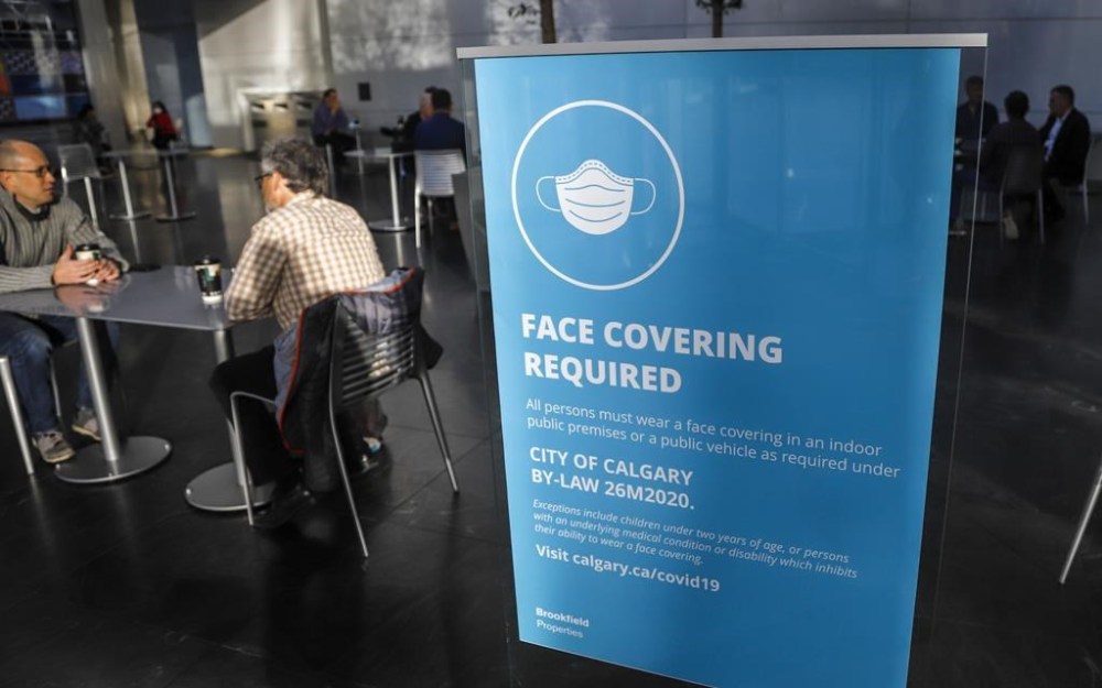 A sign instructs people to wear masks in downtown Calgary, Friday, Oct. 30, 2020. Alberta Health Services is adopting stricter masking rules in hospitals as it deals with COVID-19 outbreaks. THE CANADIAN PRESS/Jeff McIntosh