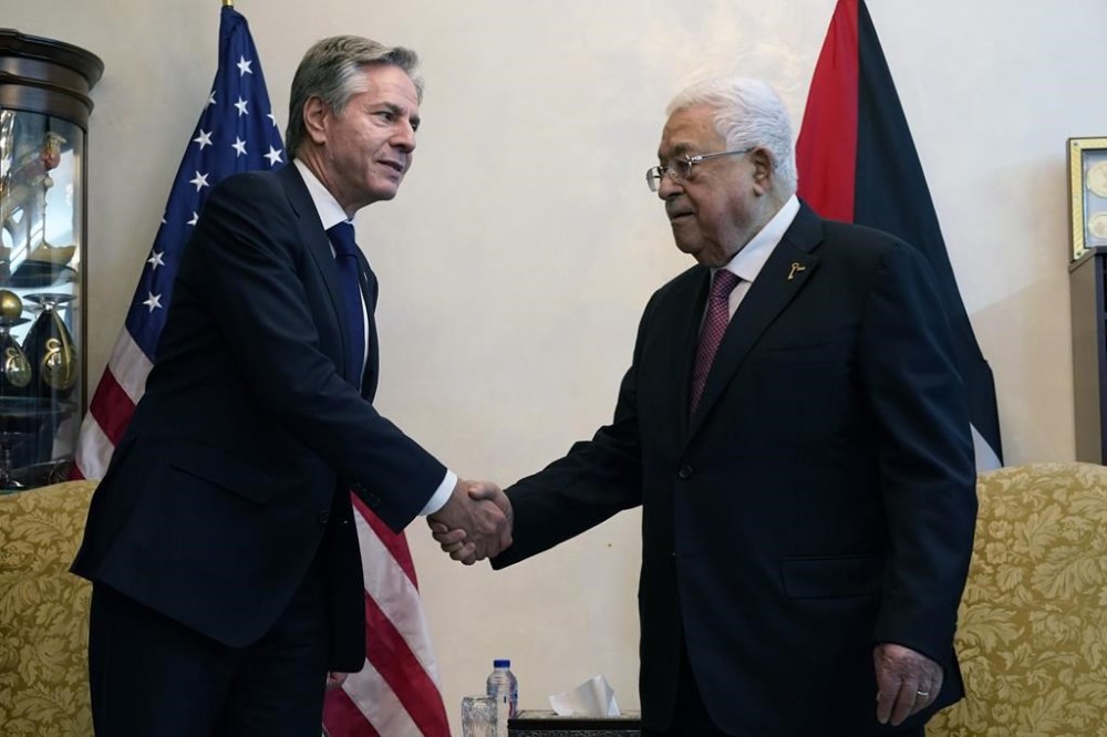 U.S. Secretary of State Antony Blinken, left, shake hands with Palestinian President Mahmoud Abbas, in Amman, Jordan, Friday Oct. 13, 2023. (AP Photo/Jacquelyn Martin, Pool)