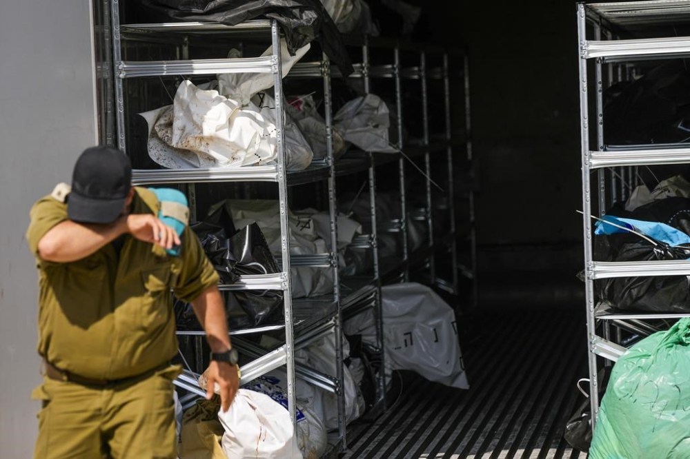 The bodies of Israelis killed in an unprecedented Hamas attack are gathered for identification at a military base in Ramla, Israel, Friday, Oct. 13, 2023. Israeli officials say 1,300 people were killed when Hamas militants burst across the border last Saturday and went on a deadly rampage through Israeli border towns, villages, army bases and a music festival. (AP Photo/Francisco Seco)
