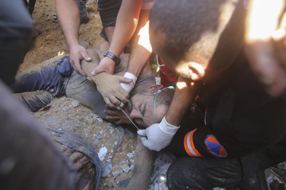 Palestinians rescue a wounded man from the rubble of a destroyed building following an Israeli airstrike in Rafah, Gaza Strip, Friday, Oct. 13, 2023. (AP Photo/Hatem Ali)