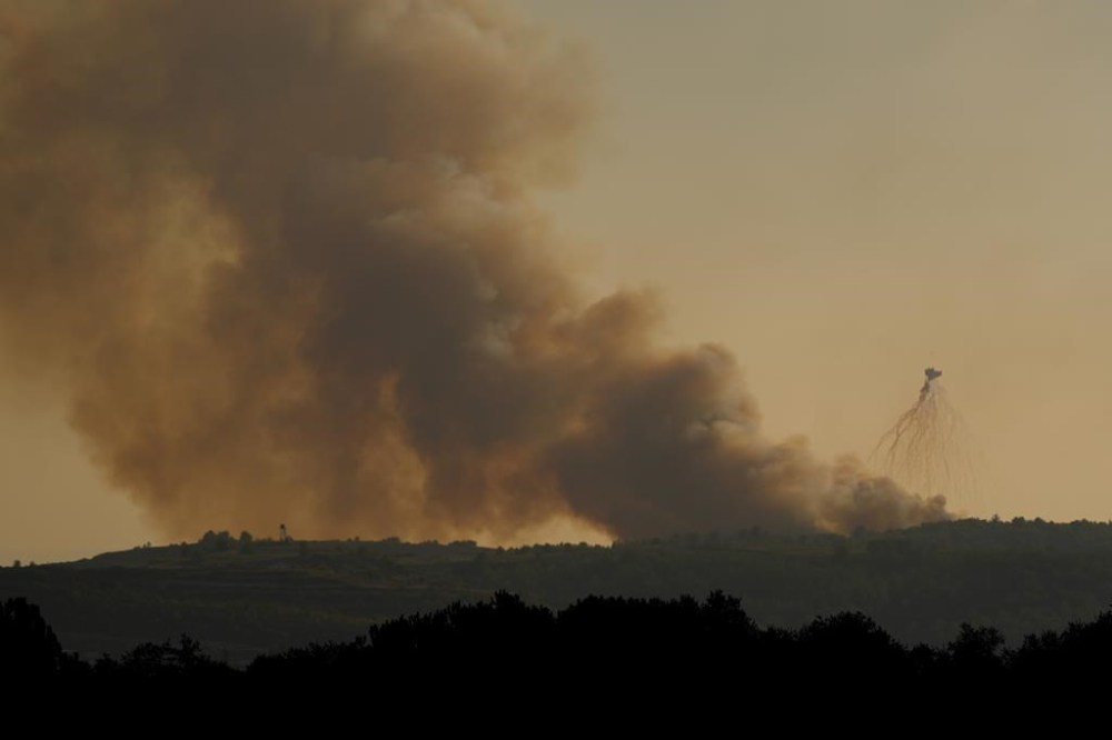 Smoke rise from Israeli shelling, at Alma al-Shaab border village with Israel, south Lebanon, Friday, Oct. 13, 2023. An Israeli shell landed in a gathering of international journalists covering clashes on the border in south Lebanon, killing one and leaving six others injured. (AP Photo/Hassan Ammar)