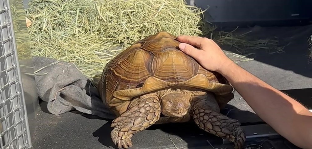 She says the sulcata tortoise was taken by ferry to his new home on Monday although his new family didn’t want to be identified for privacy reasons.