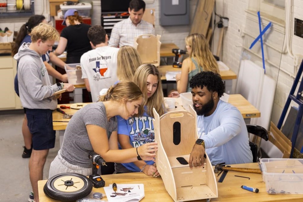 Freya’s chair was one of five made throughout several weekends early this fall at Tulane’s Scot Ackerman MakerSpace, an enormous workshop with laser cutters, 3D printers and drilling and sewing equipment.