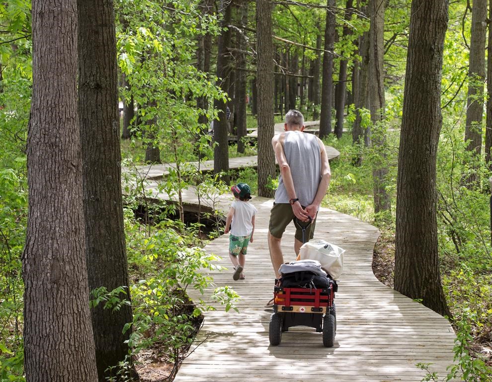 A man and his son walk along the boardwalk towards the beach at Oka provincial park on Thursday May 28, 2020 in Montreal. A small forest fire has been put out in a provincial park west of Montreal, signalling an early start to the 2024 wildfire season. THE CANADIAN PRESS/Ryan Remiorz