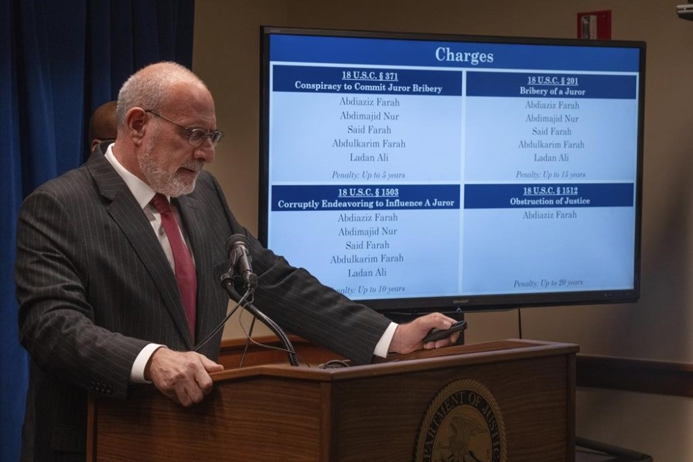 Abdiaziz Shafii Farah, Abdimajid Mohamed Nur, Said Shafii Farah, Abdulkarim Shafii Farah and Ladan Mohamed Ali are each charged with one count of conspiracy to bribe a juror, one count of bribery of a juror and one count of corruptly influencing a juror, according to the indictment.