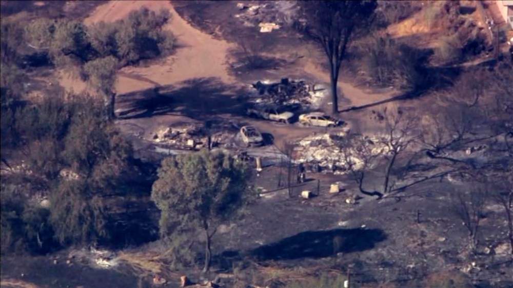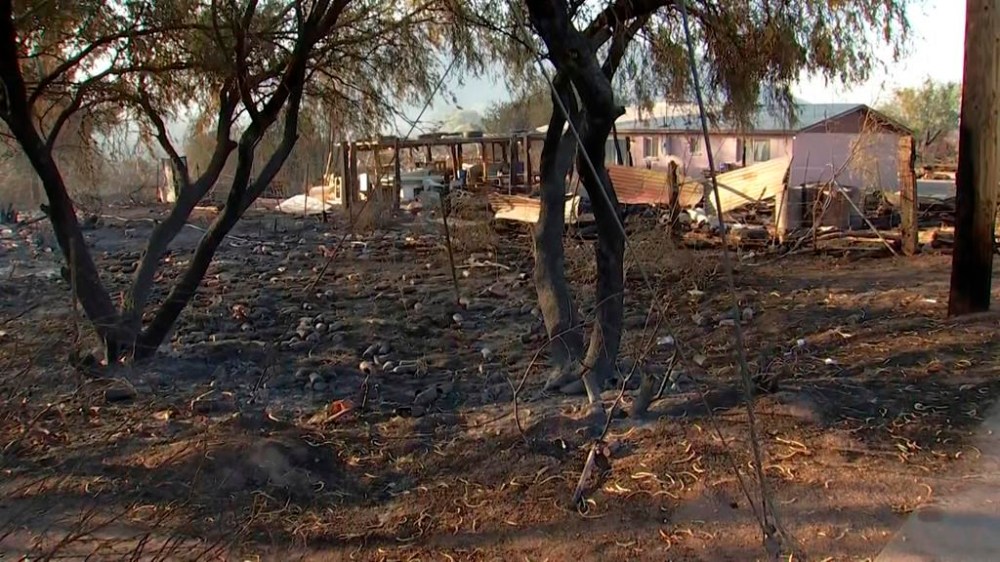This image, made from a video provided by Arizona's Family, shows damage caused by the Watch Fire on the San Carlos Apache Reservation, Ariz., on Friday, July 12, 2024. More than 400 residents on the reservation were told to leave after a wildfire spilled into the downtown area on Thursday, July 11, and destroyed at least 13 homes, officials said. (KTVK/KPHO/Arizona's Family via AP)