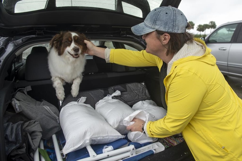 Lindsey Ranney and her dog Fig fill the trunk of Ranney's car with sandbags in preparation for Hurricane Francine from a pile of sand provided by Harrison County at the end of Courthouse Boulevard in Gulfport, Miss. on Tuesday, Sept. 10, 2024. (Hannah Ruhoff/The Sun Herald via AP)