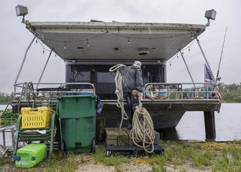 Jason Bledsoe hauls rope to a houseboat in preparation of moving it to a safer dock, Wednesday, Sept. 11, 2024, in Bayou Gauche, La., ahead of Hurricane Francine. (David Grunfeld/The Times-Picayune/The New Orleans Advocate via AP)