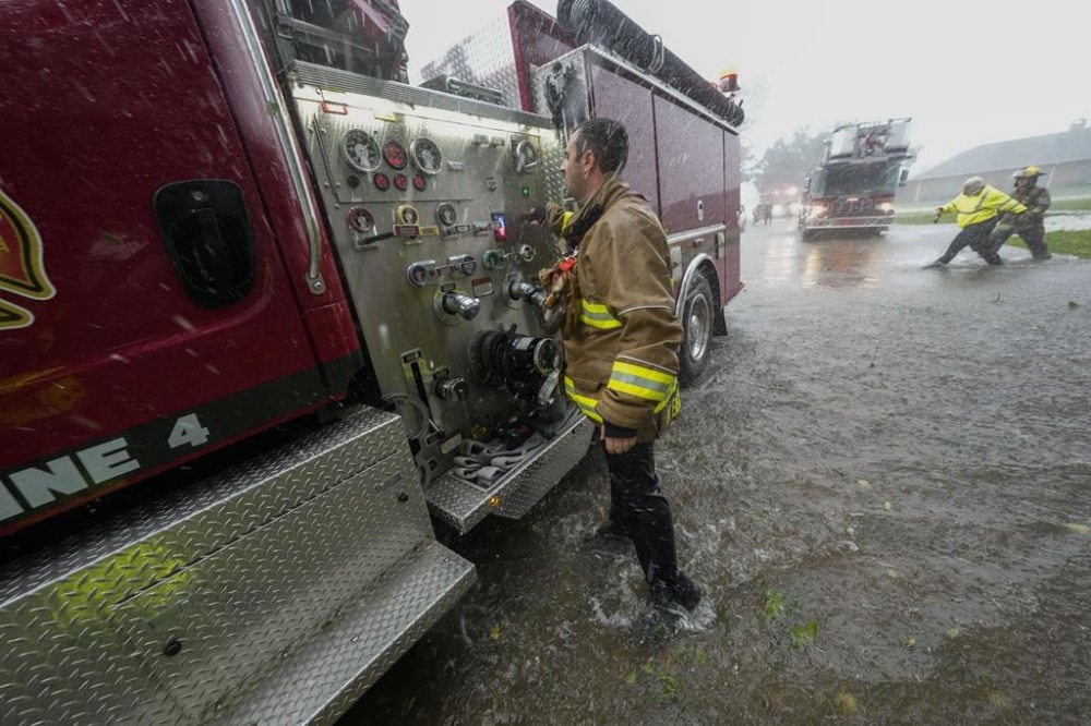 Morgan City firefighters respond to a home fire during Hurricane Francine in Morgan City, La., Wednesday, Sept. 11, 2024. (AP Photo/Gerald Herbert)
