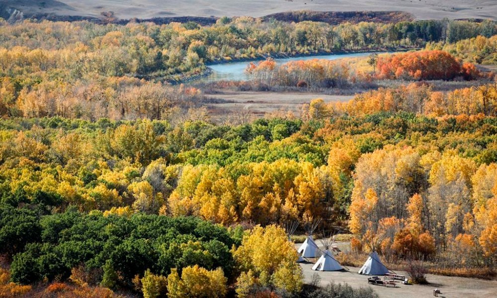 Teepees stand surround by fall foliage as the Bow River flows through on the Siksika Nation, 100 kilometres east of Calgary near Cluny, Alta., Thursday, Sept. 28, 2023.THE CANADIAN PRESS/Jeff McIntosh