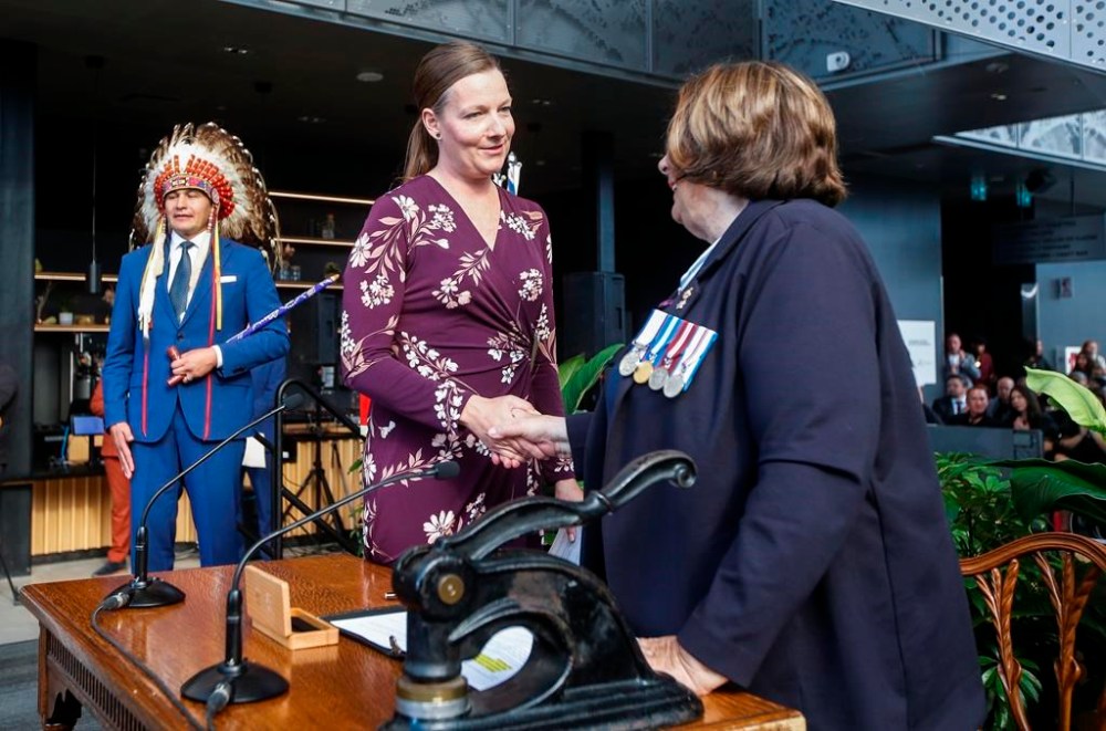 Manitoba Premier Wab Kinew looks on as Tracy Schmidt, Minister of Environment and Climate Change, Minister responsible for Efficiency Manitoba is sworn-in by Lt. Gov. Anita Neville at a Premier and cabinet swearing-in ceremony in Winnipeg, Wednesday, Oct. 18, 2023. THE CANADIAN PRESS/John Woods