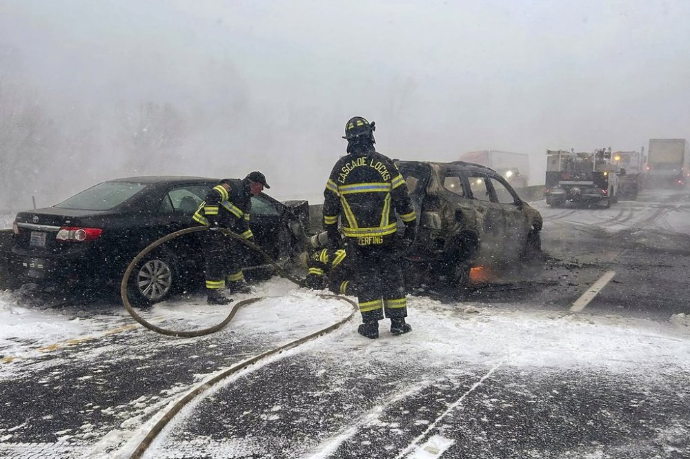 The pileup happened during near-whiteout conditions in the westbound lanes of Interstate 84, authorities said. An SUV caught fire, but its occupants escaped.