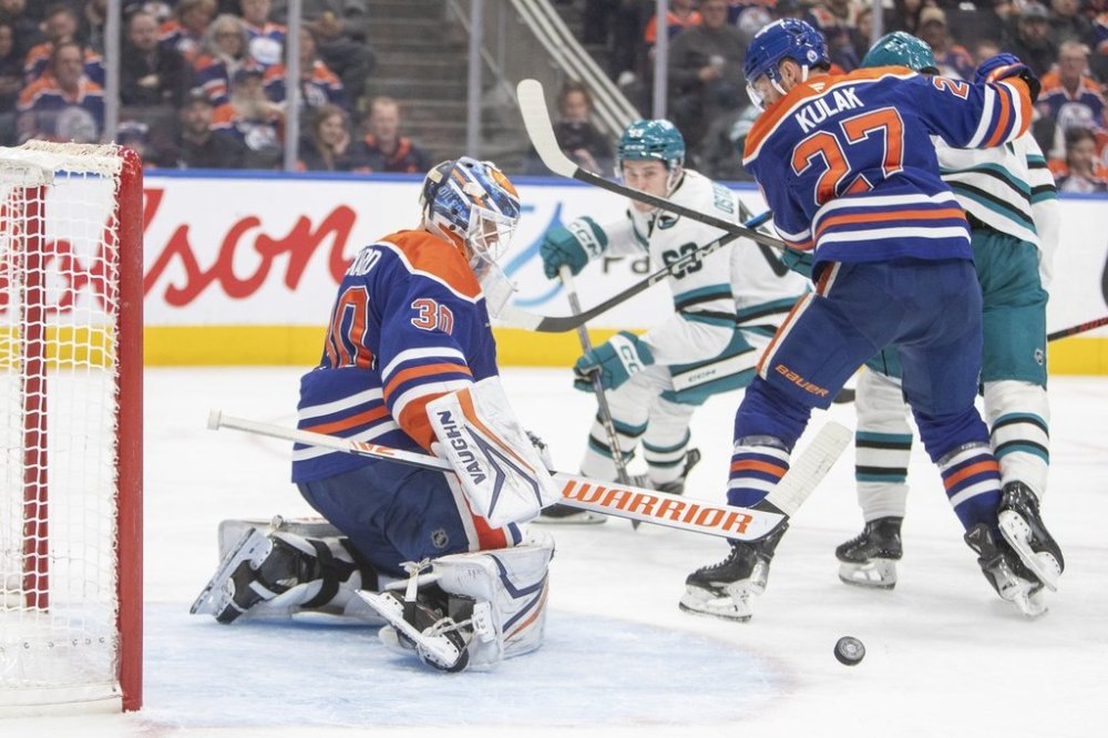 San Jose Sharks' Zack Ostapchuk (63) looks for the puck in front of Edmonton Oilers' goalie Calvin Pickard (30) as Brett Kulak (27) defends during third period NHL action in Edmonton on Friday, April 11, 2025. THE CANADIAN PRESS/Amber Bracken