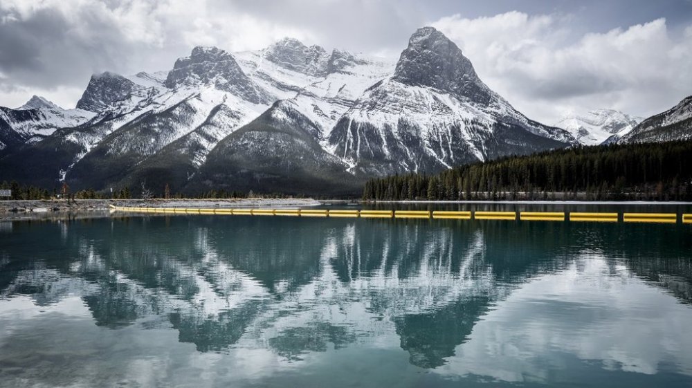 Mountains are reflected in a reservoir in Canmore, Alta., Monday, April 24, 2023.THE CANADIAN PRESS/Jeff McIntosh