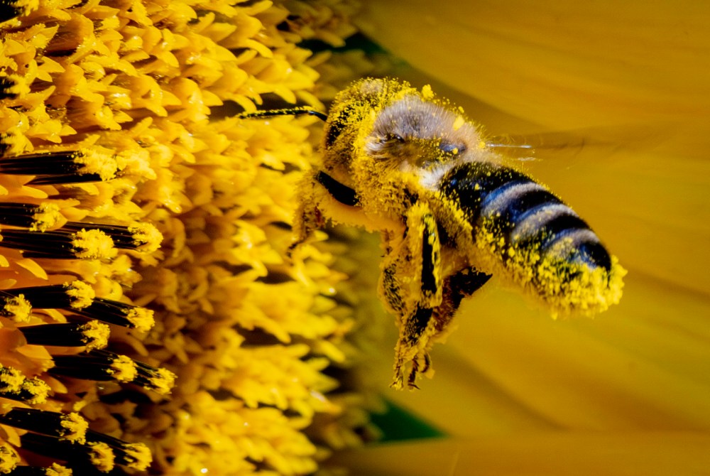 A bee collects pollen from a sunflower in a field on the outskirts of Frankfurt, Germany, Friday, Aug. 2, 2024. (AP Photo/Michael Probst)