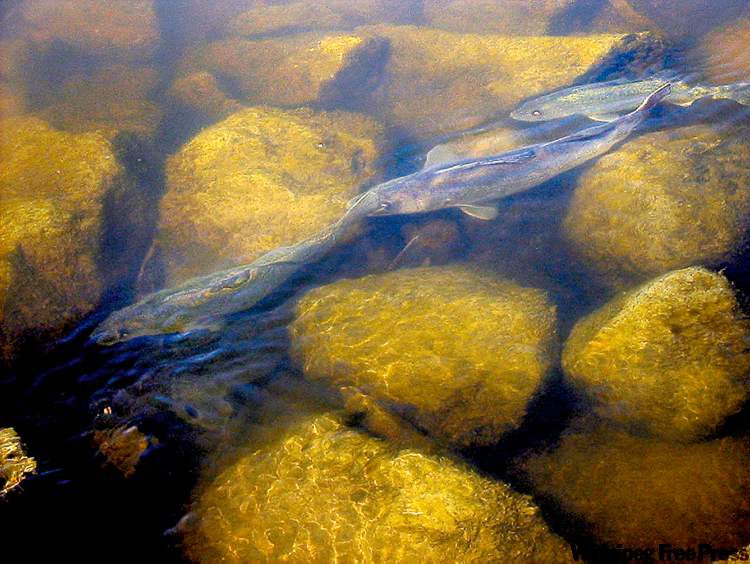 The pickerel seemed to cluster into an arrow, males following females who dropped their eggs for the males to fertilize. Only one aboriginal man was fishing at that location, using a snare — a circle of wire attached to a long stick the fish swim into — with great success.