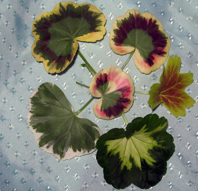 Probably the most interesting zonals in my collection are the ones referred to as brocade geraniums. The term refers to the leaves, which have various colour combinations on their surfaces, providing relief and in some cases making the leaves look like the embossed cloth from which the term originates.