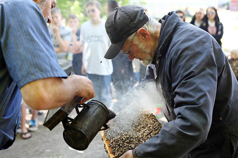 Hofer’s 81-year-old father, Edwin, is the colony beekeeper. After learning from his father, Edwin has kept bees for more than 53 years, and proudly showed off bee-laden slates to the students.