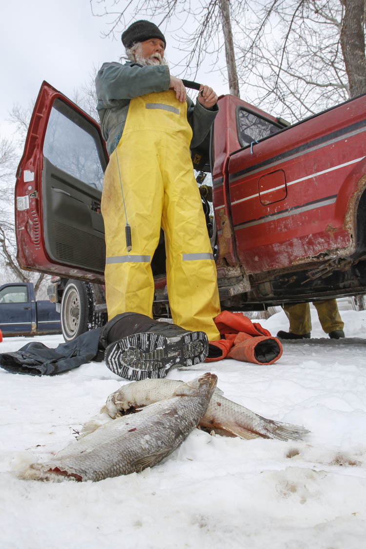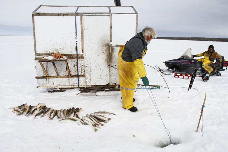 The mullet are tossed into a separate pile, which Kenyon and Strawa ignore. When the fishers reset the net and drive off to the next hole, ravens will descend to consume a fish often discarded because they command too low a price to justify the cost of shipping them to Winnipeg for processing.
