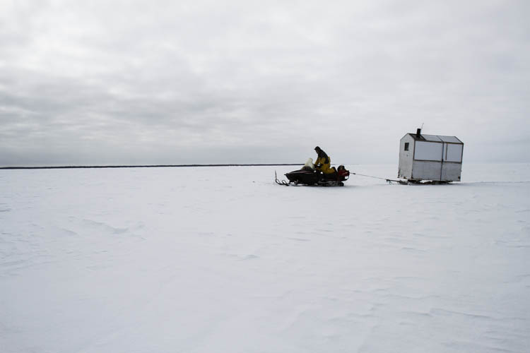 The first net is placed in less than three metres of water, only a few hundred metres from Maple Beach, a small cottage community best known as one of the many overcome by Lake Manitoba during the 2011 flood. Driving a pair of snow machines, towing a heated warm-up shack and small cargo sled, Kenyon and helper Randy Strawa head to a mound of ice that marks the near end of the net.
