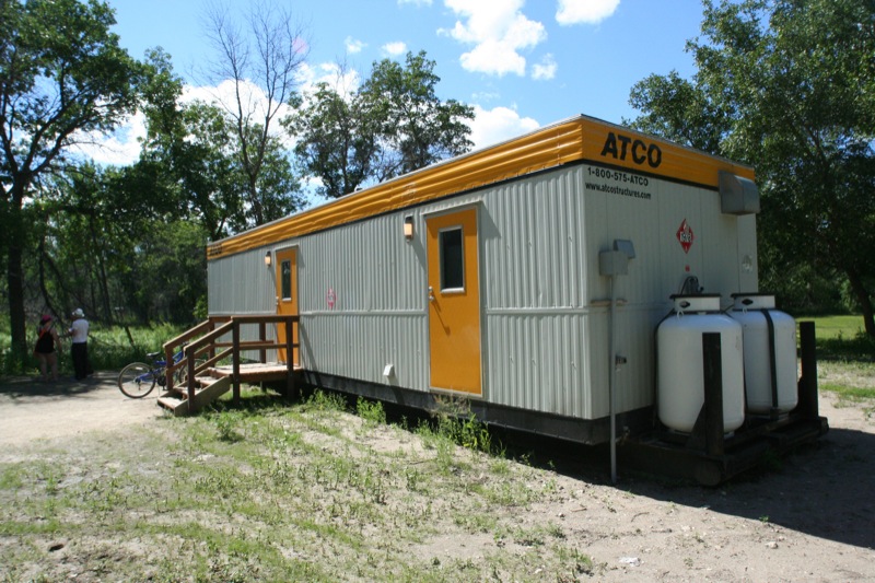 A construction trailers have been put in place of the washroom facilities at Spruce Woods Provincial Park that were destroyed by the flood of 2011. A letter from the park outside the temporary main office notifies that the lower campground has been re-opened after the devastation of the flood of 2011, and apologizes for the lack of facilities. The main campground area opened at the end of June, however it's been slow to attract people back to the area. The government of Manitoba pledged $20 million to spruce up the park by 2020.
