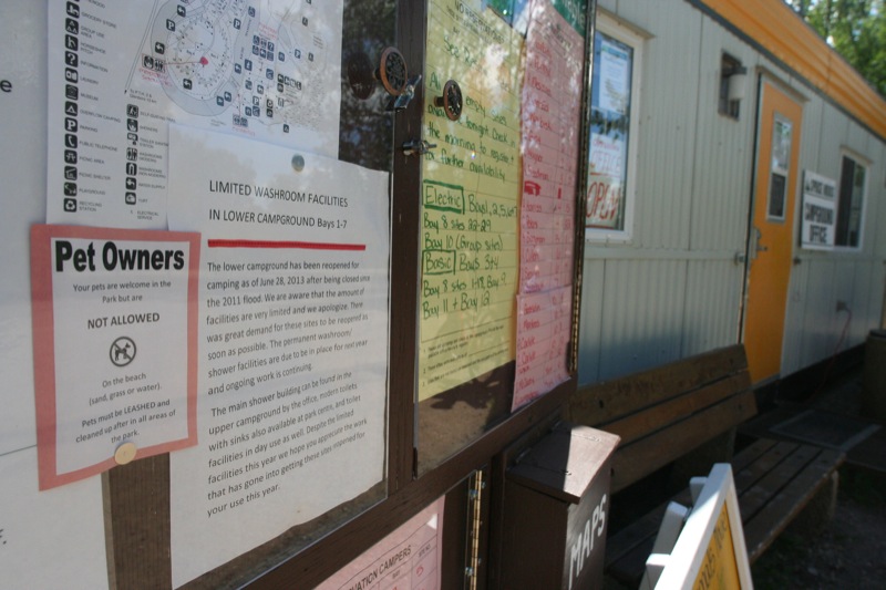 A letter from Spruce Woods Provincial Park outside the temporary main office notifies campers that the lower campground has been re-opened after the devastation of the flood of 2011, and apologizes for the lack of facilities. The main campground area opened at the end of June, however it's been slow to attract people back to the area. The government of Manitoba pledged $20 million to spruce up the park by 2020.