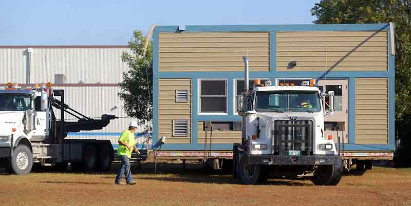 Construction crews work to place a new portable classroom on its foundation at Betty Gibson School this week.