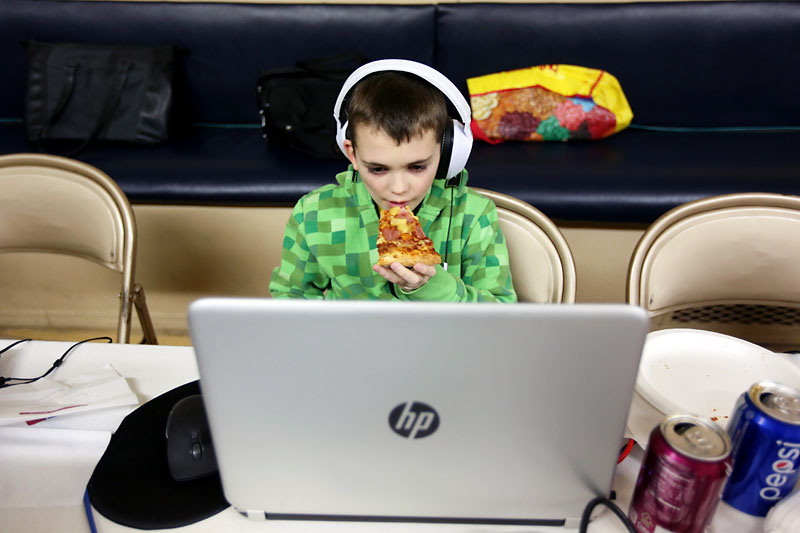 Alex Turner multitasks by eating pizza while playing “Minecraft” with friends during a Minecraft day camp fundraiser at East End Community Centre on Saturday.