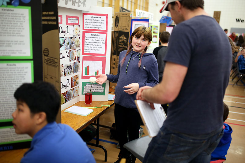 Grade 5 student Tiana Girouard explains her science fair project, Flower Power, to judge David vandenHam during Kirkcaldy Heights School’s seventh annual Science and Interest Fair on Monday afternoon.