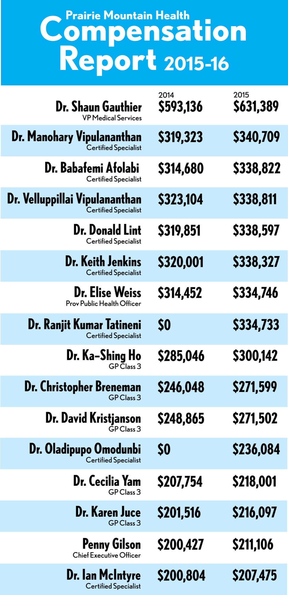 While specialists again make up the top earners in Prairie Mountain Health’s Public Sector Compensation Disclosure Report, the document only lists a small number of the doctors practising in Westman.