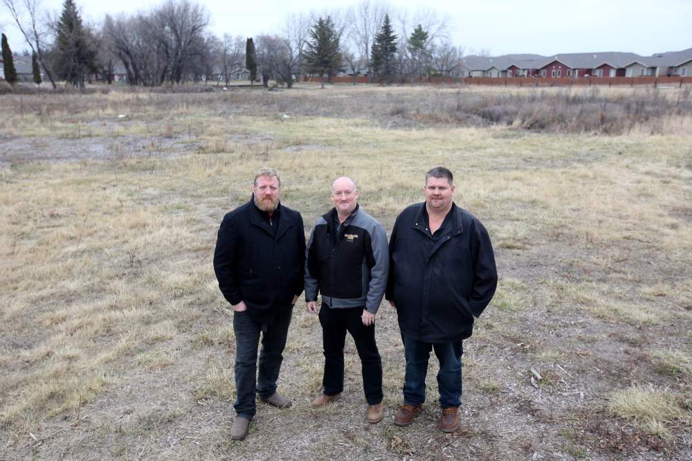 Developer Aaron Dubois with Brandon Evergreen Developments, and realtors Sandy Donald and Brad Hardy with Royal LePage stand at the future site of The Woods subdivision in Brandon’s south end on Wednesday.