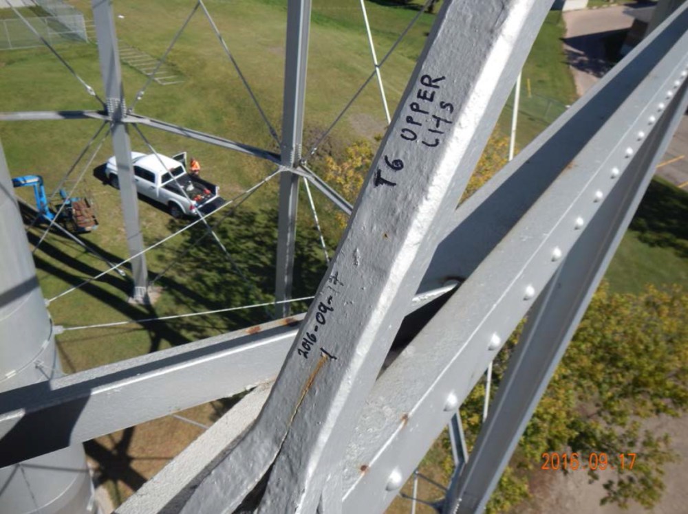 One of the photos taken during last fall's assessment of the water tower, showing a crack in a diagonal brace.