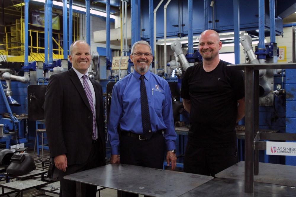 From left, Crocus Plains Regional Secondary School principal Chad Cobbe, Assiniboine Community College dean of trades and technology George MacLean and Crocus Plains welding teacher Jeremy Byczkowski stand inside the high school’s welding shop with the donated tables. (Submitted)
