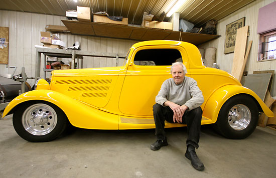 A string of vehicles has followed, but his pièce de résistance has been his bright yellow 1934 Ford three-window coupe.