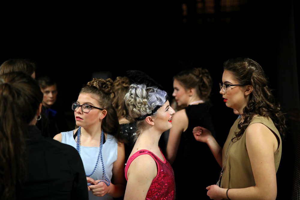 Cast members chat back stage during a dress rehearsal for Ecole Secondaire Neelin High School's production of Singing in the Rain at the Western Manitoba Centennial Auditorium on Wednesday. The play opens Thursday and runs until Saturday. (Tim Smith/The Brandon Sun)
