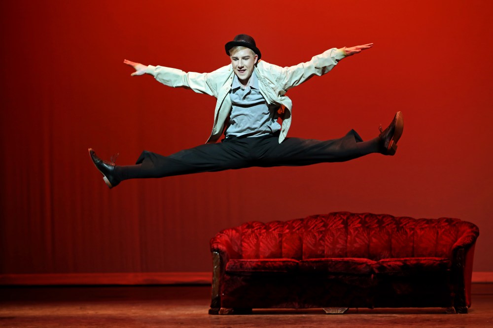 Colby Pilling leaps in the air during a song while playing Cosmo Brown during the dress rehearsal for Ecole Secondaire Neelin High School's production of Singing in the Rain at the Western Manitoba Centennial Auditorium on Wednesday. (Tim Smith/The Brandon Sun)