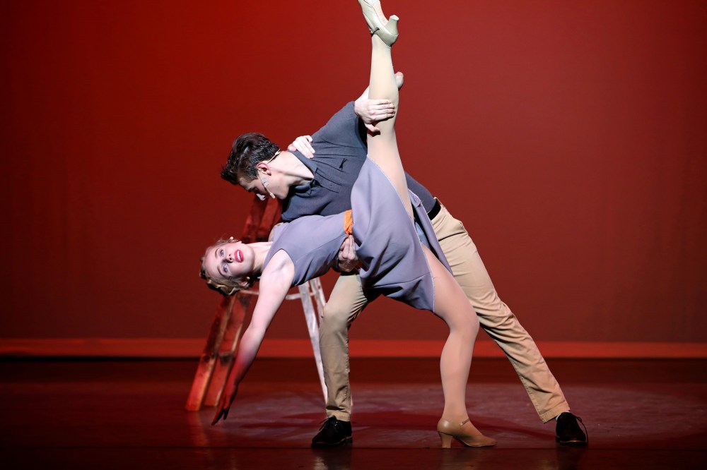 Kathy Seldon, played by Sienna Denys-Peters and Don Lockwood, played by Aiden Simard dance during the dress rehearsal for Ecole Secondaire Neelin High School's production of Singing in the Rain at the Western Manitoba Centennial Auditorium on Wednesday. (Tim Smith/The Brandon Sun)